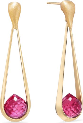 Tear-shaped simulated stones suspend from elongated drop earrings plated in luminous 18-karat gold.