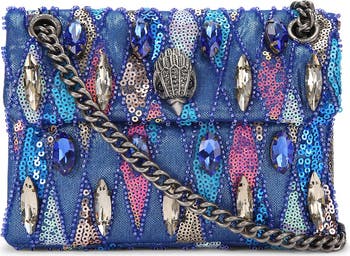 A crystal-embellished eagle head adds a signature flourish to a convertible crossbody bag elevated with faceted jewel embellishments and shiny sequins for evening-ready glamour.