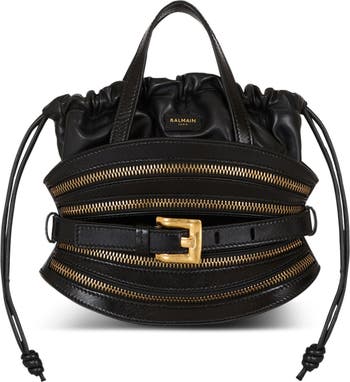 Mini Shuffle Zips bag in calfskin leather Belted style Carry in the hand, on the shoulder or across the body Adjustable and detachable leather shoulder strap with stud buttons Leather handles Balmain Paris-embossed belt Metal buckle Embossed gold Balmain Paris logo on the front Inside bag with drawstring ties Fastening with adjustable leather tie Leather lining Gold hardware Dimensions: 10 x 23 x 13 cm Main material: 100% calfskin Made in Italy Item: FN0DP017LMZP