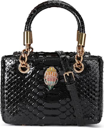 A crystal-encrusted eagle head makes a signature statement against the croc-embossed leather exterior of a structured bag fitted with dual top handles and an optional crossbody strap.