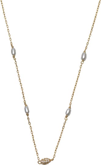 Faux pearls and pavé form stations of light along a stackable necklace crafted from sterling silver and plated with 18-karat gold.