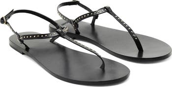 Scaled-down studs punctuate the slim leather straps on a minimalist sandal secured with a center toe post and adjustable buckle closure.