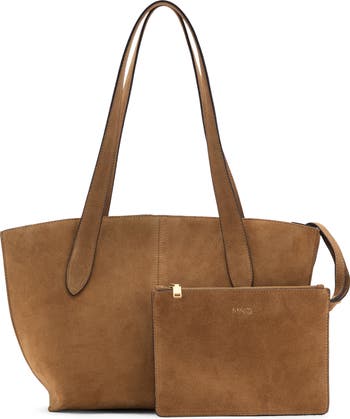 Soft and supple suede shapes a scaled-down shopper bag featuring a removable zip pouch and elongated shoulder straps for on-the-go convenience.