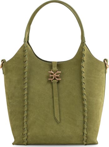 Whipstitched panels bring structure to this leather bag designed in a compact silhouette detailed with polished logo hardware. Top handles and a removable strap offer carrying options.