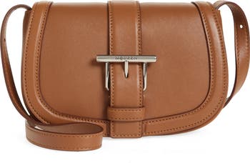 Engraved hardware and a belt-inspired strap are the centerpiece of this curved shoulder bag cut from smooth Italian leather.