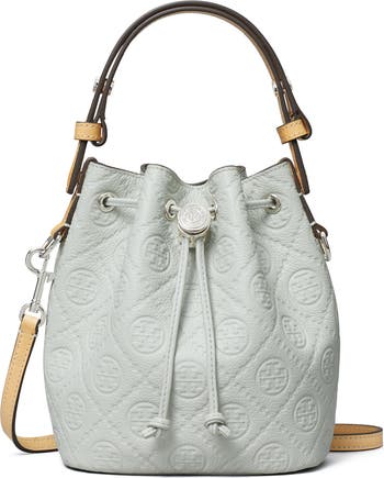 An embossed monogram pattern stands out against the pebbled leather exterior of a scaled-down bucket bag featuring a drawstring closure cinched with a logo-embellished toggle.