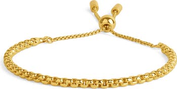A contemporary box chain plated with 22-karat gold makes a sleek and stackable bracelet.