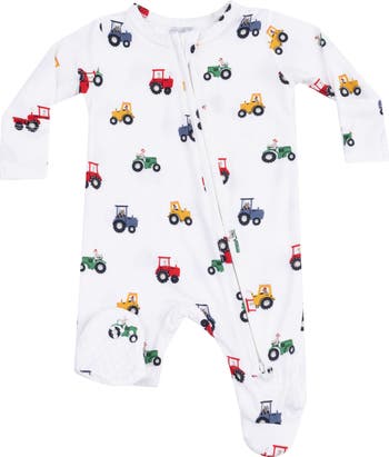 A cheerful print of farm animals riding tractors gives kid-approved charm to a soft, stretchy footie designed with a zipper that goes from chin to ankle for quick and easy changes.