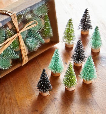 - Set the scene. mini brush trees are all the rage and the perfect accents to any display for instant holiday charm. featuring a snow effect finish, each tree stands on a wooden base.