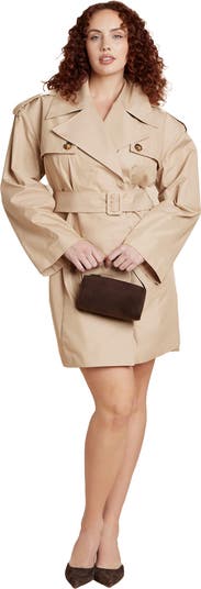 Channel bold sophistication in this trench-inspired belted mini dress with structured shoulders and oversized lapels. A double-breasted front and cinched waist create a confident, commanding style.