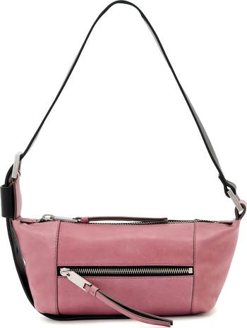 Butter-soft lambskin leather in a muted raspberry sherbet hue defines the slouchy profile of a scaled-down shoulder bag with multiple pockets and an adjustable strap for comfortable, convenient wear.