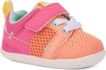 Made to be lightweight and flexible with breathable mesh inside and out, this sporty sneaker features a wide flat sole to encourage confident first steps.