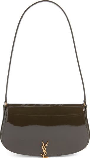 This structured top-handle bag evokes retro elegance in a gracefully rounded design shaped from glossy patent leather. An elegant, iconic—and now functional—Cassandre logo doubles as a magnetic-hinge closure.