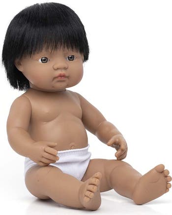 Children love caring for their very own baby doll. The 15" Anatomically Correct Baby Boy Doll from Miniland has rooted hair, articulated arms and legs allow children to dress the doll and pose it lying down or sitting up. The Baby Doll has beautiful, superbly crafted facial features and is lightly scented with a pleasant vanilla fragrance. The baby doll arrives wearing cute white underwear bottoms. Can wear additional clothing from the Miniland 15" Fashion Collection (sold separately). The doll is made of smooth vinyl, so it's comfortable to hold and easy to clean. Role play with dolls helps children develop their imaginations, and helps them learn concepts such as family, diversity, and cooperation. Miniland Educational, a leading toy manufacturing company with production facilities in Onil, Spain, is known worldwide for safe, high-quality educational toys. A great deal of thought and research goes into the design and production of Miniland Toys, but we never forget the importance of play. Manufactured in Spain, according to strict European Union safety guidelines.