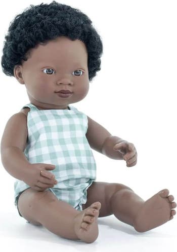 - Discover the world of friendship! The "My Friends & Me" 15" Baby boy doll with black hair and African features is a valuable member of Miniland's new collection of dolls. Made of high-quality soft vinyl with a light vanilla scent. Articulated head, arms and legs that can fully rotate allowing the doll to sit, stand or lie down.