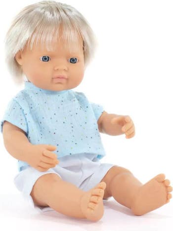 - Packaged in a box, wearing blue shorts and a blue top. Can be also wear additional clothing from our 15" Miniland doll collection. Suitable for ages 10 months and up.