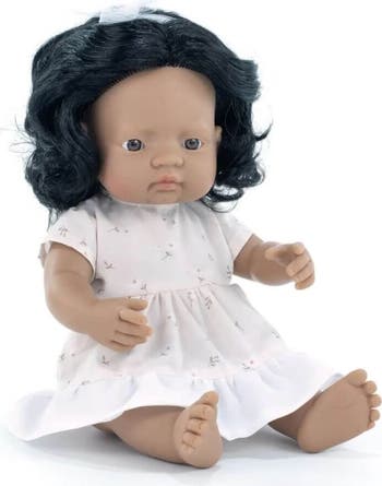 - Discover the world of friendship! The "My Friends & Me" 15" Baby girl doll with black hair and Hispanic features is a valuable member of Miniland's new collection of dolls. Made of high-quality soft vinyl with a light vanilla scent. Articulated head, arms and legs that can fully rotate allowing the doll to sit, stand or lie down.