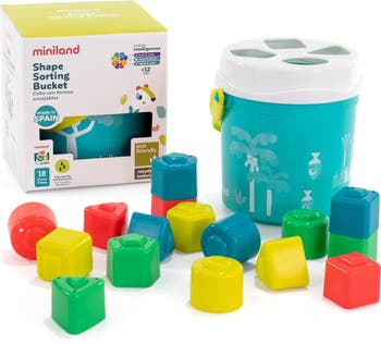 Fun game for children from one year of age, in turquoise color, which helps them learn to recognize different shapes and colors, exercise hand-eye coordination and stimulate logical reasoning. They can play by inserting the different pieces (16) into the cube through a lid with 4 basic shapes: circle, triangle, square and pentagon. The pieces can be used as sand molds and have holes through which they can "rain" water and, when they finish, they can keep them inside the cube, which helps them to be more independent. Game made in Spain, with eco-friendly materials and 100% recyclable.