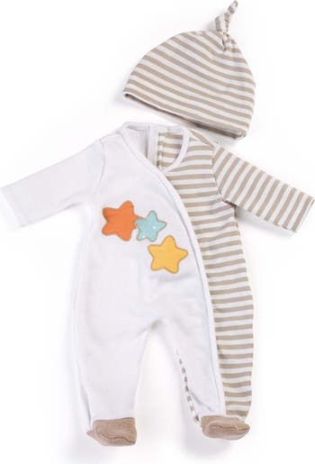 A collection of clothes and accesories for a new-born doll. Gender Neutral Pajama 15 3/4''.