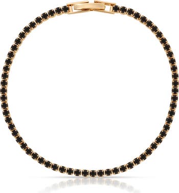 Colorful cubic zirconia shine in prong settings along this timeless tennis bracelet plated in warm 18-karat gold.