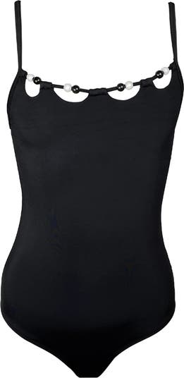 This striking black one-piece features a unique scalloped neckline, meticulously accentuated by alternating black and white pearl-like beads that trace the collarbone. Designed with thin, minimalist spaghetti straps and a streamlined silhouette, this maillot offers a high-fashion, boutique-ready profile for the young trendsetter who values understated luxury.