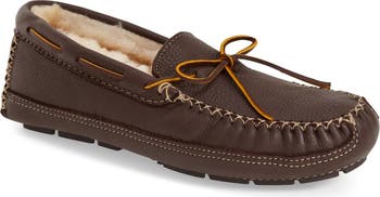 A plush shearling lining insulates a handsome leather slipper making it perfect for cold mornings.