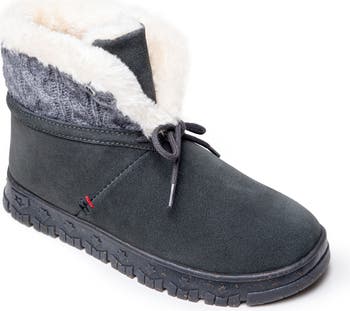 A cable-stitch colllar and plush faux-fur lining keep things extra cozy in this water-resistant slipper-bootie set on a durable indoor/outdoor rubber sole.
