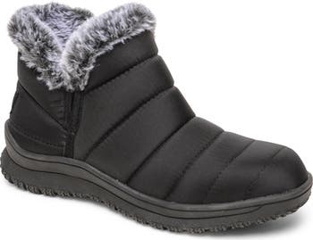 Quilted nylon locks comfort in and water out of a cozy winter bootie lined in plush faux fur with a durable rubber sole for indoor/outdoor versatility.