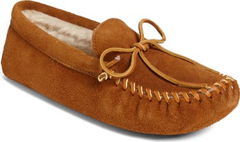 A plush faux-fur lining insulates a soft suede slipper that will warm your cold mornings.