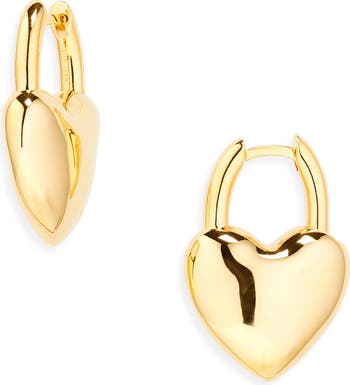 Logo-engraved hearts are integrated into the huggie hoops of these tiny earrings that shine in a warm, golden glow.