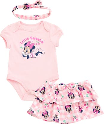 Dress your little one in this adorable Minnie Mouse outfit and get ready for a day filled with Disney magic! This comfy short sleeve creeper and skirt set comes with a matching knotted headband and features an easy-to-dress design, stylish ruffles, and a cute pink gingham print with vibrant artwork of Minnie Mouse, flowers, and cherries! Made of a soft material that keeps your baby comfortable, this fashionable Disney set is perfect for all-day adventure and play!
