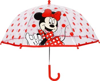 Brighten up every rainy day with a touch of Minnie magic! This Disney Minnie Mouse children’s umbrella features Minnie in her classic polka-dot dress and bow, surrounded by playful red dots on a clear dome canopy that lets kids see where they’re going while staying dry. With a sturdy 35-inch arc, curved handle, and child-safe design, it’s the perfect blend of fun and function for little Disney fans.