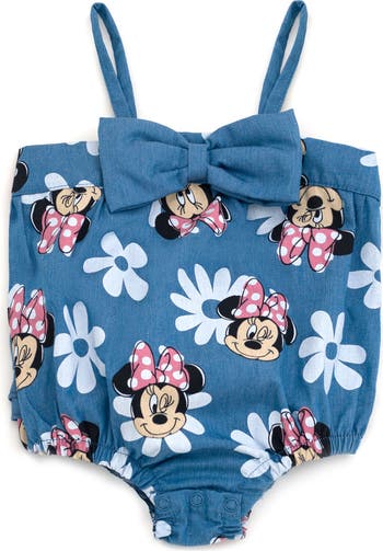 This Minnie Mouse floral chambray bubble romper is a sweet and comfy pick for your little one's warm-weather adventures. Made from soft 100% cotton, it features adjustable straps, a cute 3D bow, and a ruffle bum for extra charm. With elastic openings for a gentle fit and snap closures for easy changes, it's perfect for playdates, outings, or simply enjoying sunny days in adorable Disney style.