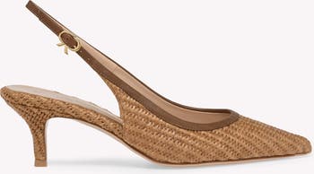Minorca ist ein Slingback aus gewebtem Raffiastoff und Leder mit einer spitzen Zehenpartie und einem 55 mm hohen Stilettoabsatz. Den Fersenriemen ziert die unverkennbare Ribbon-Schnalle. Handgefertigt in Italien.