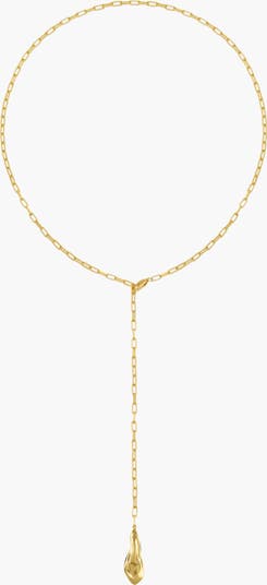 Fluid, elongated, and quietly striking. The Minos Lariat Long Necklace in Gold is designed to draw the eye with its soft, sculptural drop and clean, modern line. A delicate chain falls into a polished molten-shaped pendant, creating movement and length that enhances the neckline. The Y-shaped silhouette adds a subtle statement refined yet effortlessly bold. Minimal, but never unnoticed.