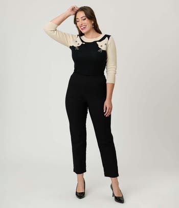 This sweet 1950s style knit sweater is crafted in a silky soft knit fabric while the contrasting three-quarter length sleeves offer a kitschy design.