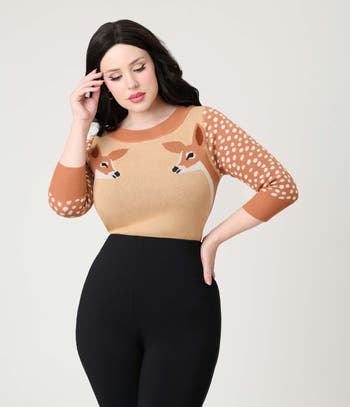 This sweet 1950s style knit sweater is crafted in a silky soft knit fabric while the contrasting three-quarter length sleeves offer a kitschy design.