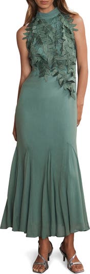 Teal maxi dress with a halter neckline, embroidered leaf appliqué, full-length godet hemline with a fastening through the back.
