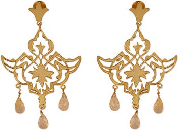 The Mir Citrine Drops are handcrafted in 22k gold-plated brass, featuring intricate filigree work with faceted Citrine drops. Inspired by Islamic scriptures, the design creates a statement look while remaining comfortable for extended wear. These earrings are suitable for daytime occasions, festive settings, and evening events.
