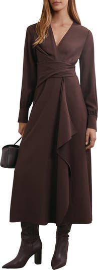 A cascading drape adds a grace note to a wool-kissed shirtdress offered in a rich hue.