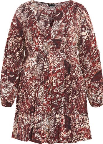 Paisley plays in a pretty way across a vibrant dress shaped with rows of ruffles.