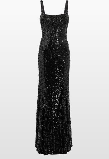 Framed by delicate straps and a Square Neckline, this gown is fully adorned with light-catching embellishment for a striking finish. The silhouette is fitted through the bodice and gently flares towards the hem, creating a balanced and elegant shape. The sparkle subtly shifts in tone from top to bottom, adding a dynamic touch. Ideal for formal occasions, evening receptions or red carpet moments.