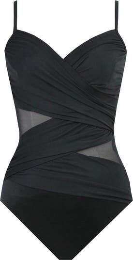 Draped panels and angled mesh insets sculpt knockout curves in this one-piece swimsuit enhanced by smoothing, shaping Miratex® fabric. Look 10 pounds lighter in 10 seconds!®