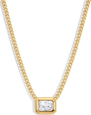 Chunky chains are having a moment. The Mirage Necklace is a thick gold chain with an emerald-shaped crystal in the center. This sturdy silhouette is so cool-girl coded.