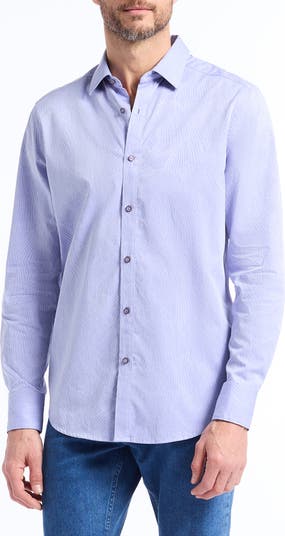 A swirling pattern is rendered in muted hues to keep it from overwhelming any look you build around this smart cotton button-up shirt.