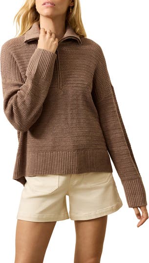 A slouchy fit relaxes the sporty vibes of this quarter-zip sweater knit in a chunky stitch from soft, breathable linen and organic-cotton yarns.