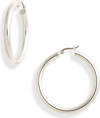 A hollow silhouette brings bold design and lightweight comfort to these statement-size sterling silver hoop earrings.