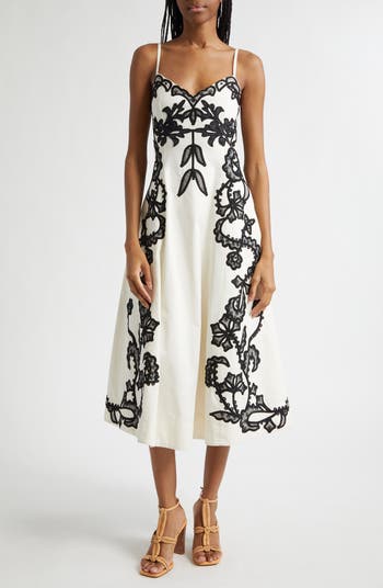 Inky floral embroidery romances this fit-and-flare midi cut from crisp cotton and suspended by slender straps.
