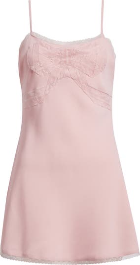 Lovely lace trims this slinky square-neck mini cut from glossy satin and fronted with a darling bow.