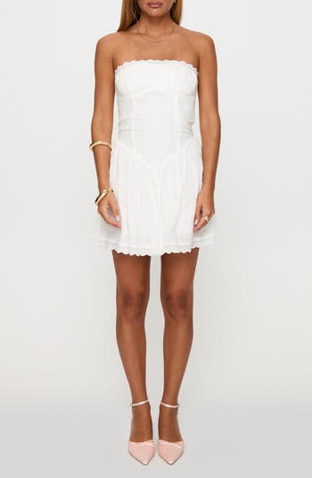 Lovely lace romances this little white dress made with a fitted bodice and meant to show off your shoulders.